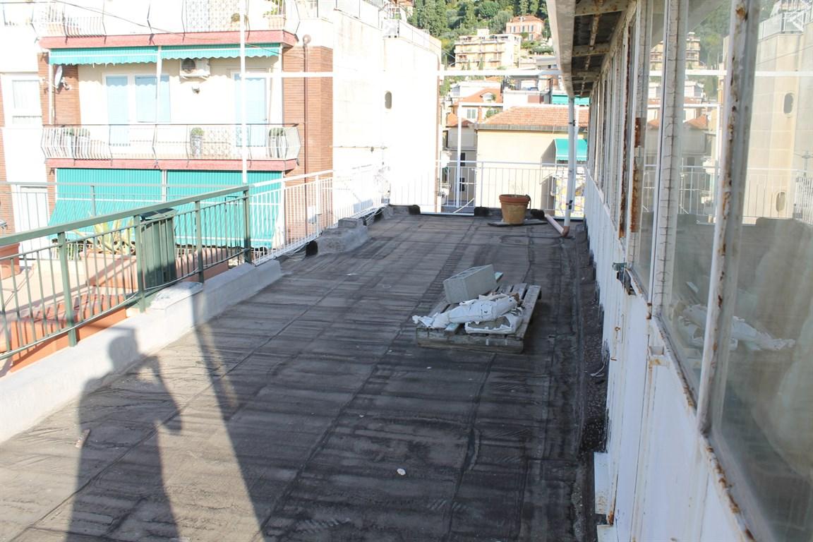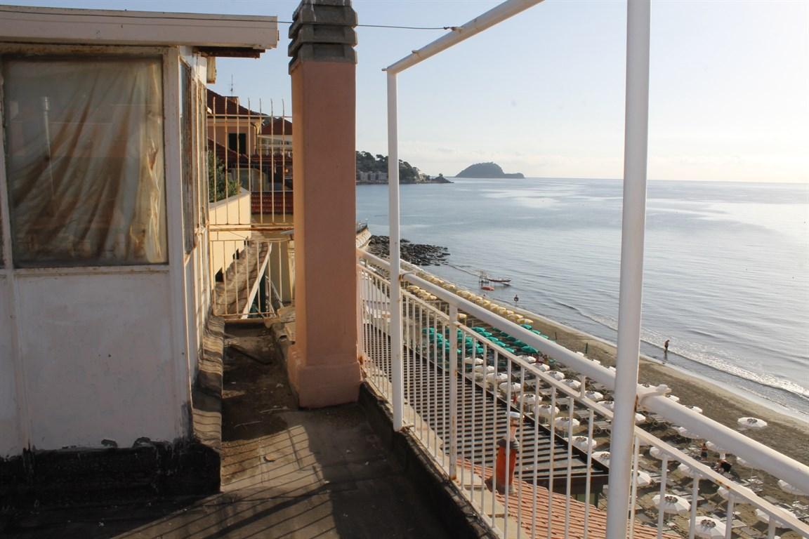Vicinissimo a piazza partigiani, alloggio sul mare, ultimo piano con lastrico solare, vista mare, terzo e quarto piano senza ascensore, circa mq. 90 + bilocale sopra da unire con scala interna in fase di ristrutturazione composto da ingresso, cucina con scorcio sul mare, una cameretta, soggiorno, camera matrimoniale e camera con 2 letti, bagno, balcone, termo autonomo.