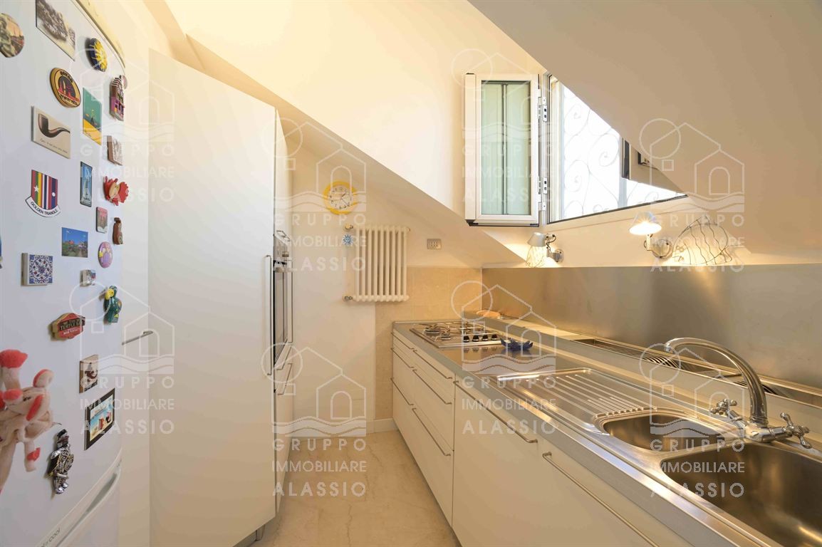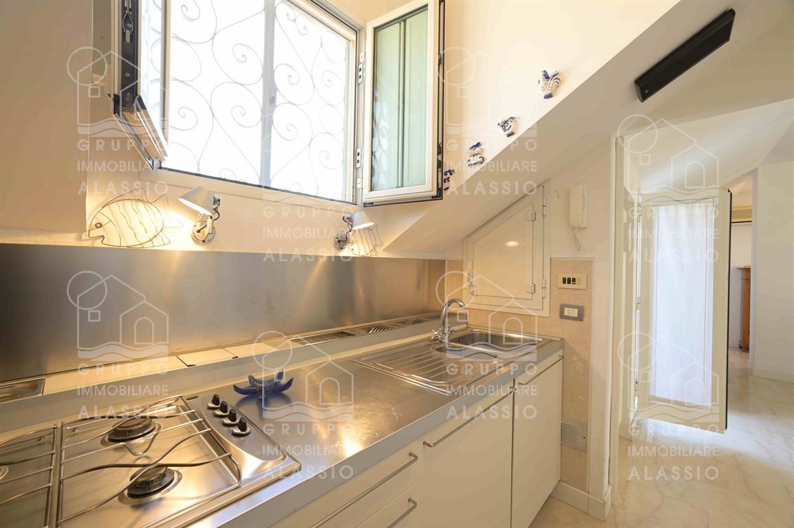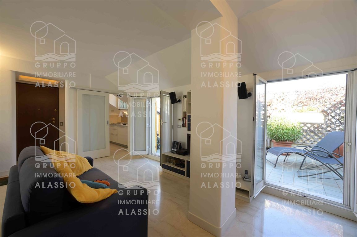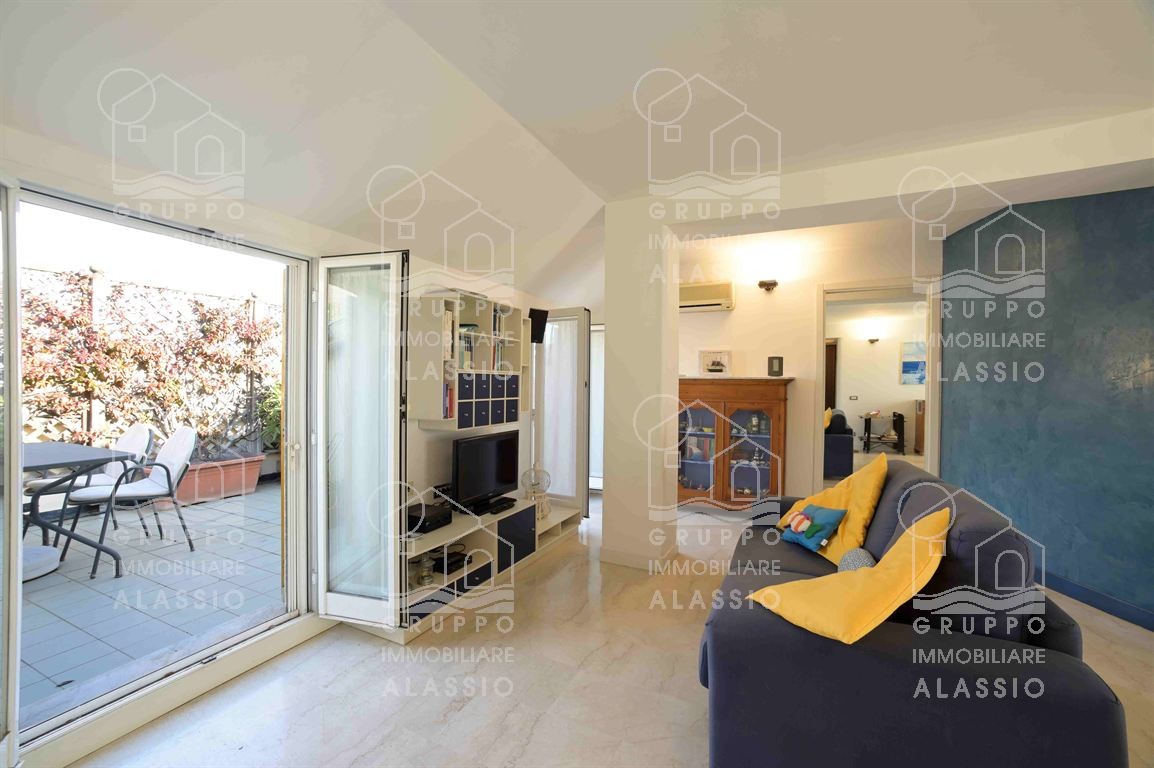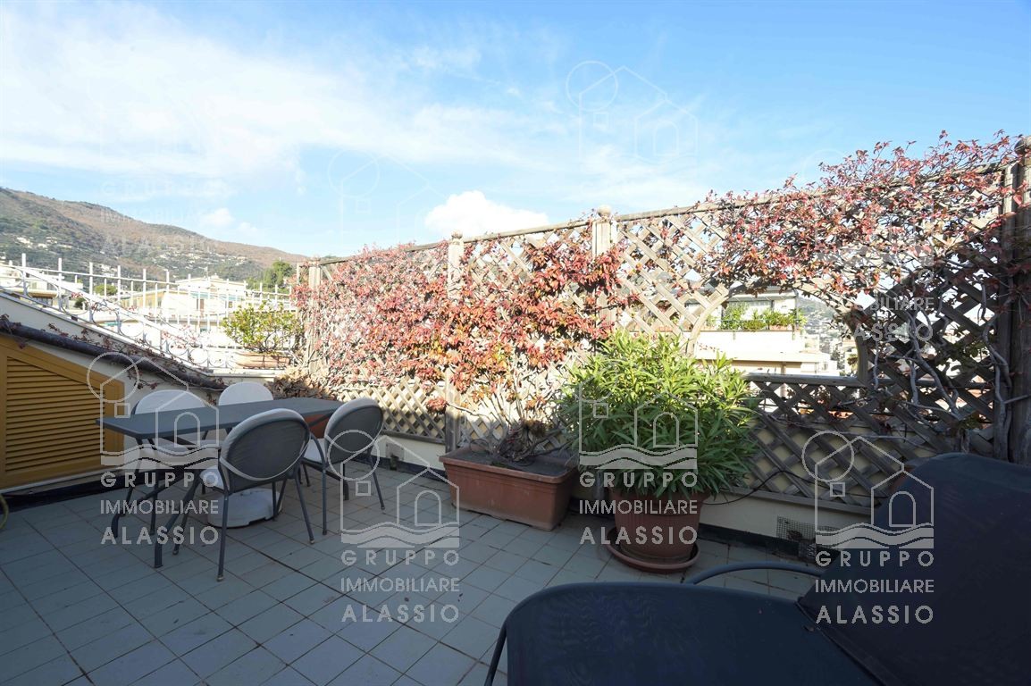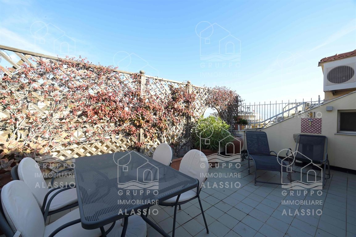 Siamo lieti di proporre in vendita, come nuova esclusiva, questo attico ubicato nel pieno centro di alassio, in zona tranquilla e non trafficata, a soli 200 metri dalla spiaggia ed a due passi dai supermercati, ristoranti, negozi del budello, palestre, tennis e padel, farmacie, bar , pasticcerie, edicole e tabaccherie. collocato all’ultimo piano di edificio edificato alla fine degli anni ’60, l’appartamento si presenta in ottime condizioni e possiede un gradevole terrazzo come sfogo esterno, dove è possibile cenare, fare colazione ed ammirare una bella vista aperta sia verso il mare sia verso le colline con un certo livello di privacy nonostante la centralità. internamente l’unità abitativa possiede un ingresso, soggiorno ampio e luminoso con due aree, cucina separata, due camere da letto, doppi servizi, entrambi finestrati, di cui uno molto piacevole con la vasca idromassaggio, terrazzo vivibile, due balconi e ripostiglio. l’immobile beneficia di un’eccezionale luminosità, grazie sia alla sua collocazione al piano alto, sia grazie alle sue due esposizioni laterali, le quali consentono di ricevere la luce solare per tutto il giorno. la posizione di ubicazione, il terrazzo, l’ultimo piano e gli spazi interni dell’alloggio sono caratteristiche intrinseche decisamente favorevoli e corrispondenti alla classica ricerca della casa al mare. l’alloggio è dotato di termo autonomo e aria condizionata.