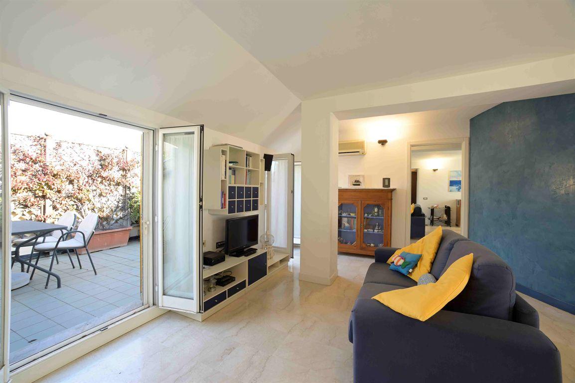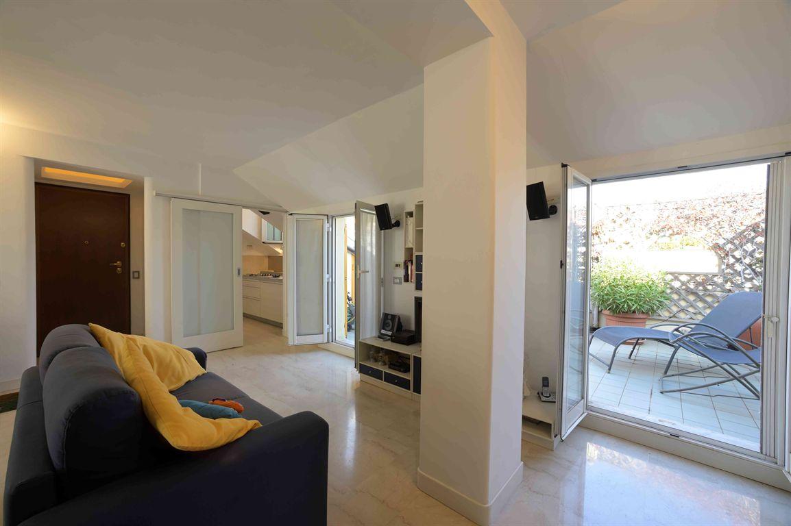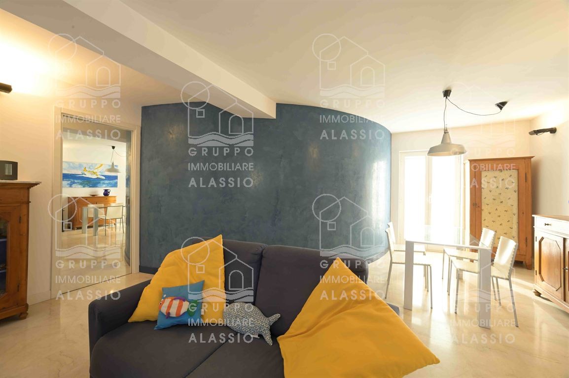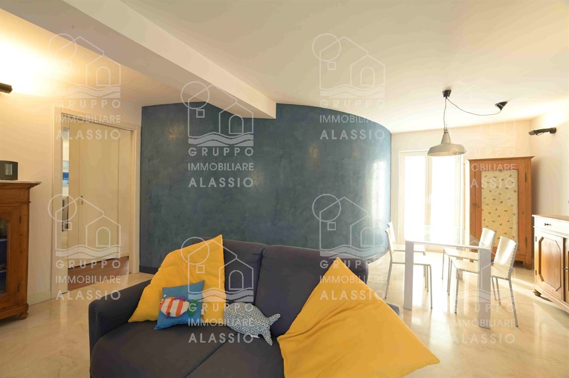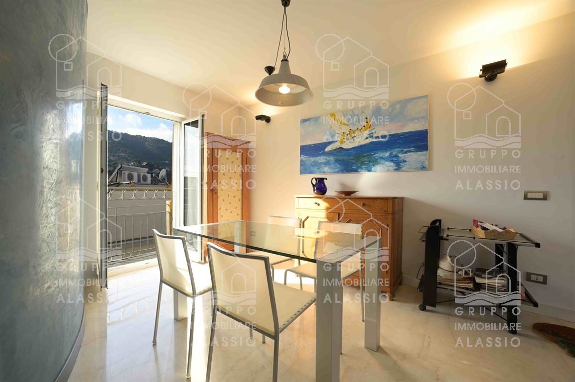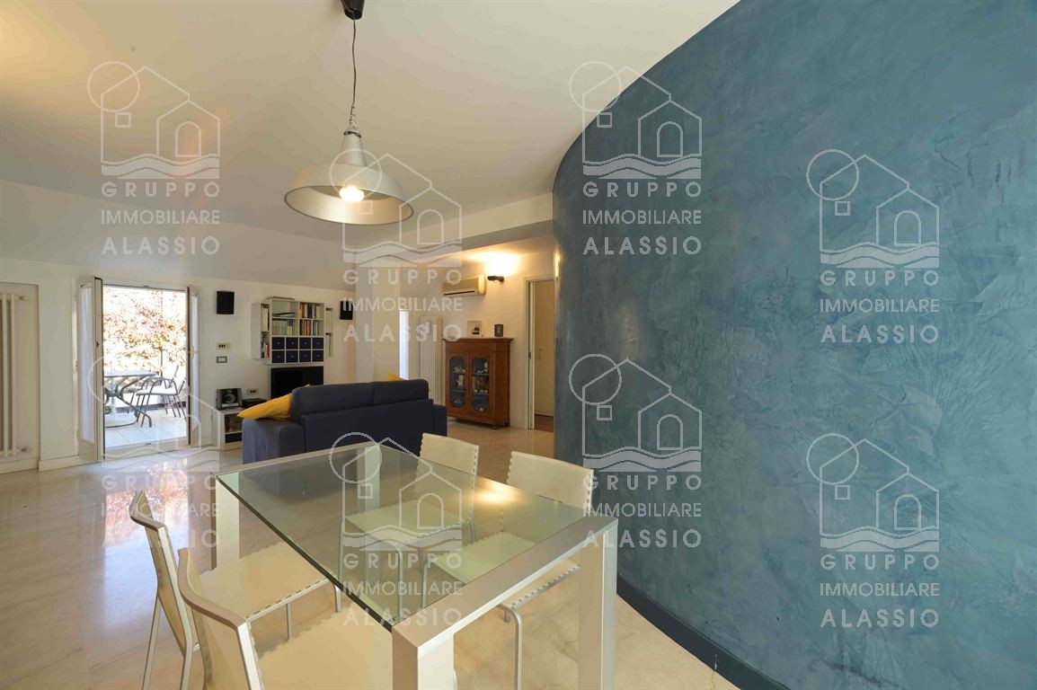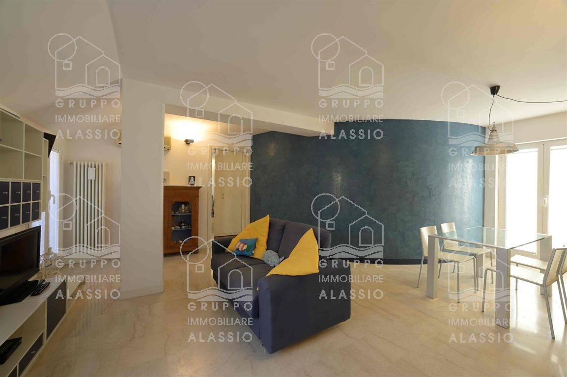 Siamo lieti di proporre in vendita, come nuova esclusiva, questo attico ubicato nel pieno centro di alassio, in zona tranquilla e non trafficata, a soli 200 metri dalla spiaggia ed a due passi dai supermercati, ristoranti, negozi del budello, palestre, tennis e padel, farmacie, bar , pasticcerie, edicole e tabaccherie. collocato all’ultimo piano di edificio edificato alla fine degli anni ’60, l’appartamento si presenta in ottime condizioni e possiede un gradevole terrazzo come sfogo esterno, dove è possibile cenare, fare colazione ed ammirare una bella vista aperta sia verso il mare sia verso le colline con un certo livello di privacy nonostante la centralità. internamente l’unità abitativa possiede un ingresso, soggiorno ampio e luminoso con due aree, cucina separata, due camere da letto, doppi servizi, entrambi finestrati, di cui uno molto piacevole con la vasca idromassaggio, terrazzo vivibile, due balconi e ripostiglio. l’immobile beneficia di un’eccezionale luminosità, grazie sia alla sua collocazione al piano alto, sia grazie alle sue due esposizioni laterali, le quali consentono di ricevere la luce solare per tutto il giorno. la posizione di ubicazione, il terrazzo, l’ultimo piano e gli spazi interni dell’alloggio sono caratteristiche intrinseche decisamente favorevoli e corrispondenti alla classica ricerca della casa al mare. l’alloggio è dotato di termo autonomo e aria condizionata.